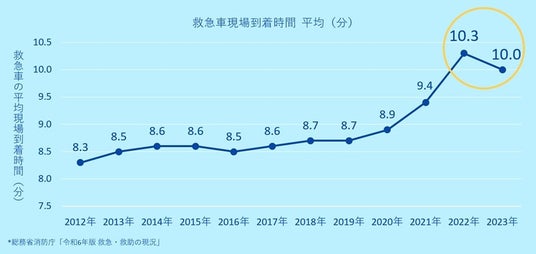 街中や施設内で突如倒れた傷病者に遭遇した際、救急車を呼んで助けを求めますが、救急車の平均到着時間は数年前よりも延伸しており、2022年は10.3分、2023年は10.0分かかっています(図1)。