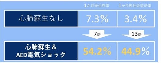 傷病者の1か月後社会復帰率は、心肺蘇生とAEDによる一次救命を行わなかった場合は3.4%ですが、一次救命処置を行った場合は44.9%まで上がります(図2)。つまり、救急車到着前に、心肺蘇生とAEDによる一次救命が重要となります。