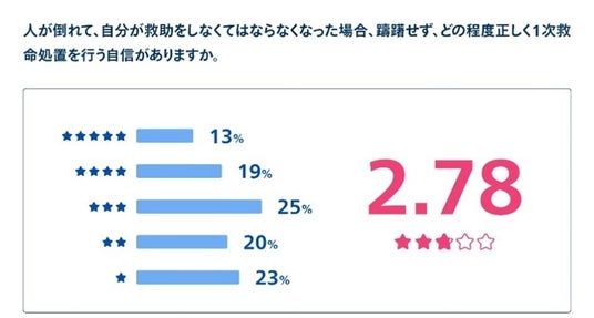また、一次救命処置を躊躇せず自信をもって行えるかについては、回答者平均は5段階評価(点)のうち2.78 点となりました。1~2 点は43%の一方、4~5 点は32%で、躊躇せず自信も持って一次救命処置を行う人の割合が少ないことがうかがえました(図4)。