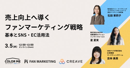 クリエイターとの共創を通じて企業のマーケティング課題を解決する、株式会社CREAVE(本社:東京都千代田区、代表取締役社長:中村真奈、以下 CREAVE)は、ECサイト構築サービス「カラーミーショップ byGMOペパボ」を運営するGMOペパボ株式会社(本社:東京都渋谷区、代表取締役社長:佐藤 健太郎)、株式会社ファン・マーケティング(本社:東京都渋谷区、代表取締役社長:藤井 一晃)との3社合同セミナーを開催します。