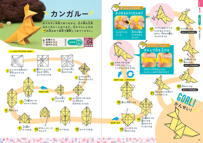第2弾となる『もっと頭がよくなる!ちょいムズおりがみ』では、カンガルーやタヌキ、ティラノサウルスといった“ちょいムズ”モチーフからはじまり、海賊船、忍者、トナカイと徐々に難度がアップ。最後はげきムズモチーフとして龍やマーメイド、キングドラゴンなど全33作品を紹介しています。