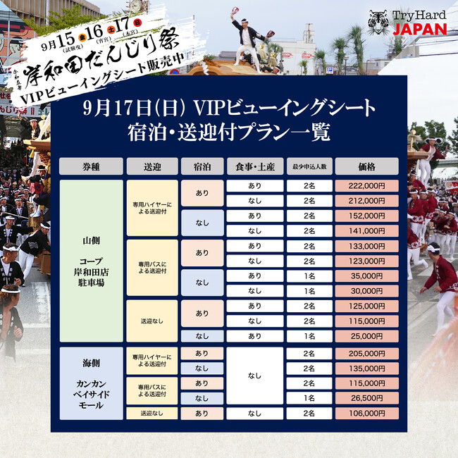 株式会社トライハードジャパン(所在地:大阪市中央区)は、2023 年 9 月 15 日(金)、16 日(土)17 日(日)に大阪府岸和田市にて開催される「令和5年度岸和田だんじり祭」において、宿泊や送迎を含むVIPビューイングシートのオプショナルツアーを販売開始いたしました。一般チケットも好評販売中です!!