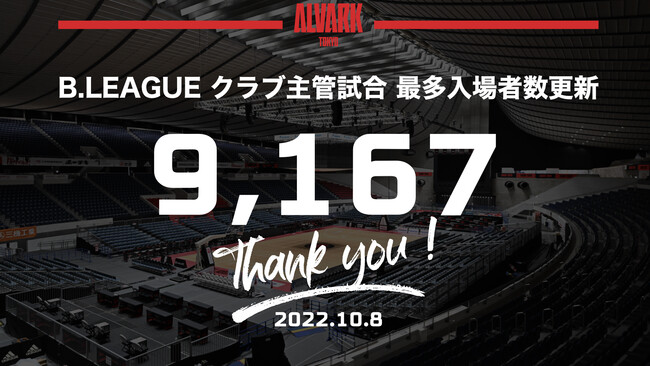昨日10月7日(金)に、同じく第2節千葉ジェッツ戦@国立代々木競技場第一体育館で記録した8,919名を上回り、B.LEAGUE クラブ主管試合 1試合 最多入場者数を更新し、新記録を樹立しましたので、お知らせいたします。