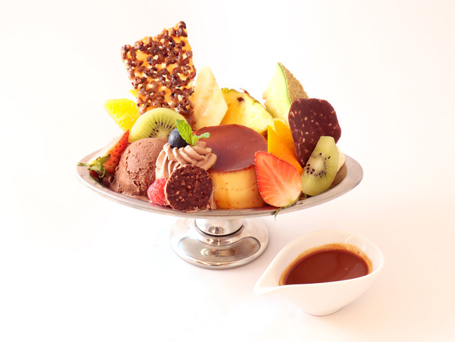 「さんなべきりやま山たまご」を使ったクラシックな濃厚プリンに、季節のフルーツとベルアメールオリジナルのクーベルチュールを使ったショコラクリームを添えました。