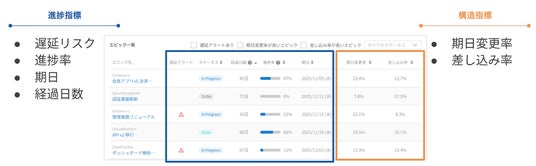 今回リリースした新機能「プロジェクト進捗分析」は、プロジェクトに紐づくエピック単位で、進捗状況および遅延リスクを一覧で可視化する機能です。進捗率や期日といった結果指標に加え、期日の変更や差し込みなど、遅延を引き起こす要因を同時に確認できる点が特徴です。これにより、
