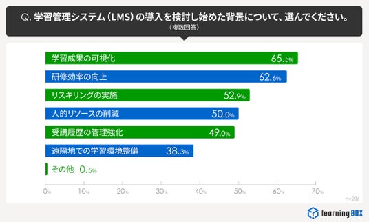 学習管理システム(LMS)導入検討の背景として、「学習成果の可視化」「研修効率の向上」「リスキリングの実施」が上位を占めました。近年、企業の人材育成において「リスキリング(学び直し)」が注目されており、これが学習管理システム(LMS)の必要性を押し上げる要因となっていることが伺えます。