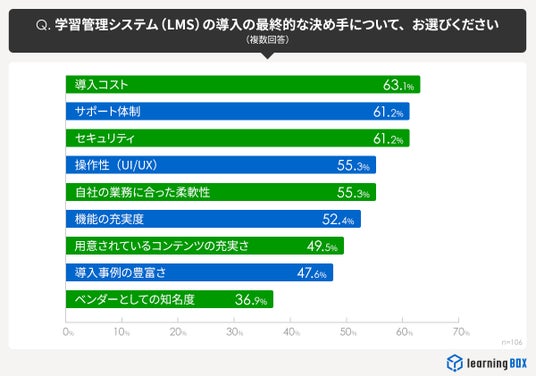 学習管理システム(LMS)導入の決め手として、「導入コスト」「サポート体制」「セキュリティ」が上位に入りました。この結果から、企業が導入時の負担を抑えながらも、運用サポートや安全性を重視していることが確認できます。