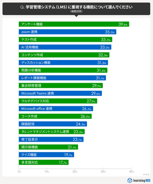 「アンケート機能」が39.6%でトップとなりました。これは、前述の「現在、従業員の学習管理をどのように行っているか」の回答で分かるように、従業員の学習状況を把握する手段としてWebアンケートが活用されている現状と一致しています。