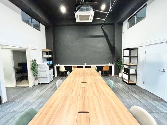 コワーキングスペースの中央にある8名利用可能なテーブル席。吹き抜けで天井が高く、開放感がある空間です。