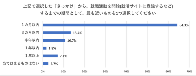 「上記で選択した『きっかけ』から、就職活動を開始(就活サイトに登録するなど)するまでの期間として、最も近いものを1つ選択してください」と質問したところ、1位「1カ月以内」が64.3%、2位「3か月以内」が13.4%、3位「半年以内」が10.7%となりました。