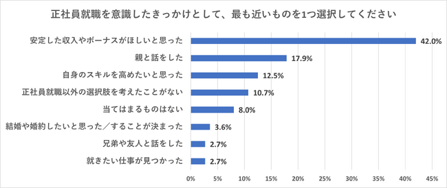 「正社員就職を意識したきっかけとして、最も近いものを1つ選択してください」と質問したところ、1位「安定した収入やボーナスがほしいと思った」が42.0%、2位「親と話をした」が17.9%、3位「自身のスキルを高めたいと思った」が12.5%となりました。