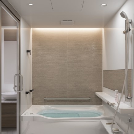 光を壁面に当て、反射した光で室内を美しく照らす間接照明です。お好みの壁柄と組み合わせて、よりシンボリックなバスルームに。