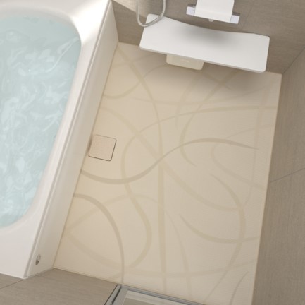 北欧のテキスタイルを彷彿とさせる柄でカーペットやラグを敷いたようなデザインです。冷たく、硬い印象のバスルーム浴室があたたかく、柔らかな雰囲気になります。コーディネートしやすいようトーンを抑えながらも印象的な空間を演出します。