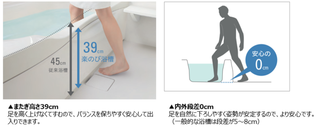 女性のすねの平均高さから導いた「またぎ高さ39cm」なのでバランスを保ちやすく安心して出入りできます。さらに、浴槽の底面と洗い場の床との段差をなくしたことで姿勢を安定させやすくなりました。