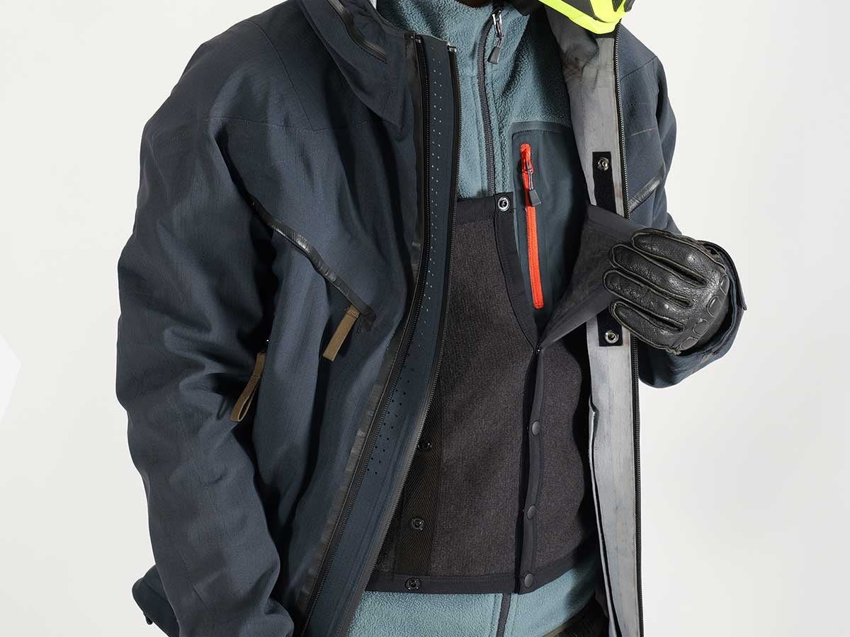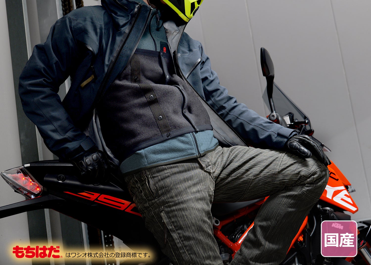 ジャケットを脱がずに着脱できるライダー仕様。気温変化にもすばやく対応。