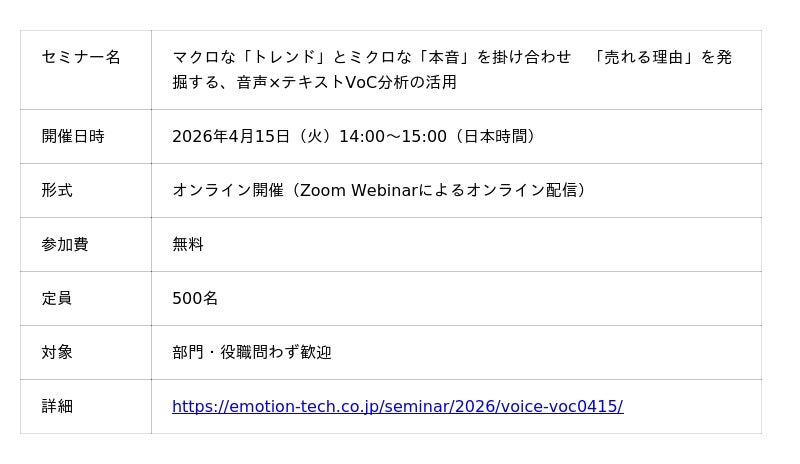 商談ビッグデータが勝ち筋に導くインサイトアナリシス(TM)「Front Agent」を開発・提供するUmee Technologies株式会社(本社:東京都調布市、代表取締役:新納 弘崇、以下「ユミー」)は、株式会社エモーションテック(本社:東京都港区、代表取締役:今西 良光、以下「エモーションテック」)と共催で、4/15(火)14:00開催のオンラインセミナー『マクロな「トレンド」とミクロな「本音」を掛け合わせ「売れる理由」を発掘する、音声×テキストVoC分析の活用』を開催いたします。