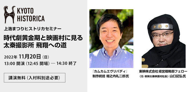 「東映太秦映画村」をモデルとする「条映太秦映画村」が主な舞台となり、「時代劇をとりまく諸相」も作品テーマのひとつとして取り扱われている連続テレビ小説「カムカムエヴリバディ」 の制作統括と、東映太秦映画村で長年、撮影場所とテーマパークという双方の側面を見てきた映画村元社長の当人が、それぞれの視点から太秦の未来についてディスカッションを展開。撮影所と時代劇の未来について彼らが如何なるビジョンを思い描いているか伺っていきましょう。講演会自体は無料(要映画村入村料)です。奮ってご参加ください。