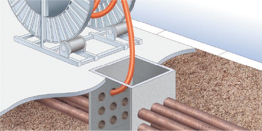 電力ケーブル保護管用「SEライナー工法」は、劣化管路に形状記憶塩ビ管を挿入し、蒸気加熱により円形復元、非開削で新たな塩ビ管路を誕生させます。