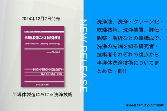 株式会社シーエムシー出版(本社:東京都千代田区神田錦町1-17-1、代表取締役:金森洋平)は、半導体洗浄技術の最新動向について詳述した書籍『半導体製造における洗浄技術(監修:羽深等/反応装置工学ラボラトリ)』(定価:税込71,500円)を、2024年12月2日に発売いたします。本書籍は、当社ECサイトおよび全国の書店にてご購入いただけます。