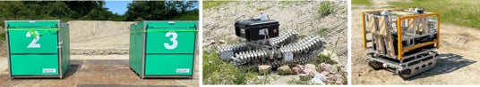 河道閉塞は山間部で起きるため、大型の重機を搬入することは困難です。大須賀教授らは、ヘリコプターで運搬可能な1t程度の小型機材をコンテナに収納して運び入れ、状況に応じて機材を組み替えて異なる作業を行えるようにしました。今回のデモでは4種類のロボットを使い、偵察と排水という2種類のデモを実施します。