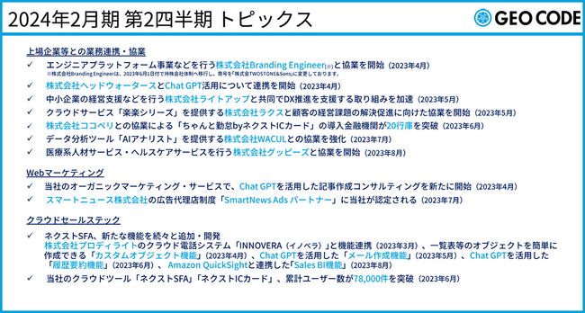 トピックスとしては、上場企業との業務連携・協業に関することが7件、ネクストSFAの新たな機能の追加・開発が5件など、積極的な取り組みを行っています。