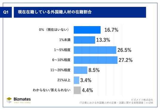 ビズメイツ株式会社(本社:東京都千代田区、代表取締役社長:鈴木 伸明、以下「当社」)は、外国籍人材を1人以上採用した実績のある、従業員数30~499人のIT企業の人事担当者294名を対象に 「IT企業における外国籍人材の定着・活躍に関する実態調査」を実施しました。
