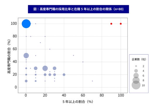 在籍5年以上の割合は0~20%に集中しており、長期定着は限定的であることが示されました。特に、高度専門職比率が100%でありながら在籍1年未満が中心の企業(青い点)も見られ、採用の新規化や定着途上の状況が示唆されます。一方で、高度専門職のみで構成され、かつ9割以上が5年以上在籍する企業(赤い点)も見られ、採用と長期定着を両立する例も確認されました。