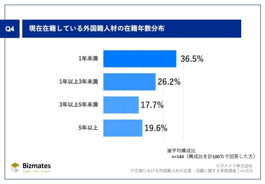 Q4.Q2で「0%(現在はいないが、過去に採用実績あり)」「わからない/答えられない」以外を回答した方にお聞きします。現在在籍している外国籍社員の在籍年数分布について、ご記入ください。