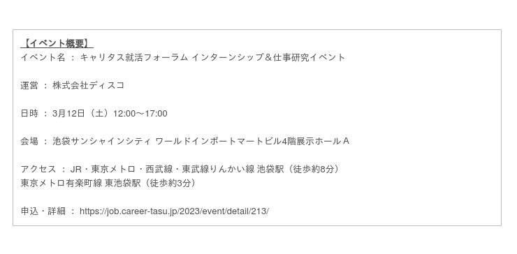 日付:3月12日(土) 会場:池袋サンシャインシティ ワールドインポートマートビル4階展示ホールA 申込・詳細:https://job.career-tasu.jp/2023/event/detail/213/