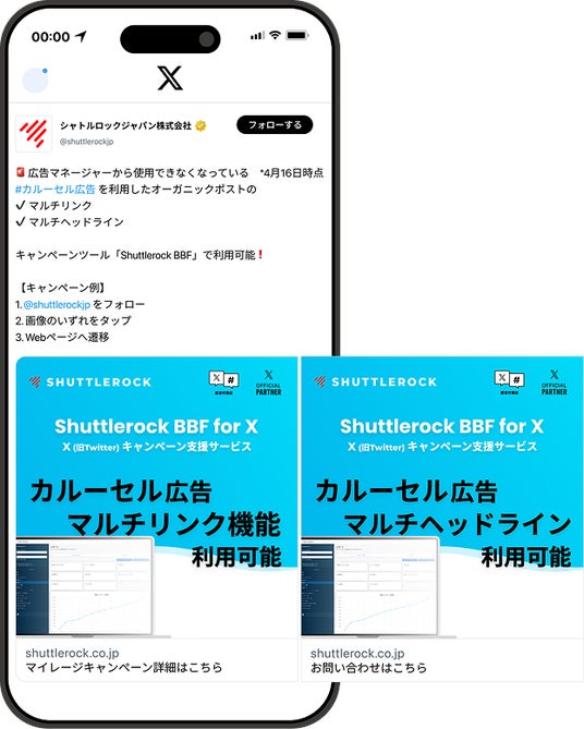 2026年4月より、X 広告マネージャーで使用できなくなった「コレクション広告の投稿」「カルーセル広告のマルチリンク、マルチヘッドライン機能」* が、API ベンダーのシャトルロックジャパン株式会社(本社:東京都新宿区、代表取締役:金光 展意、以下、シャトルロックジャパン)が開発及び提供している X (Twitter) キャンペーンツール「Shuttlerock BBF for X」では引き続き使用可能であることを、お知らせいたします。