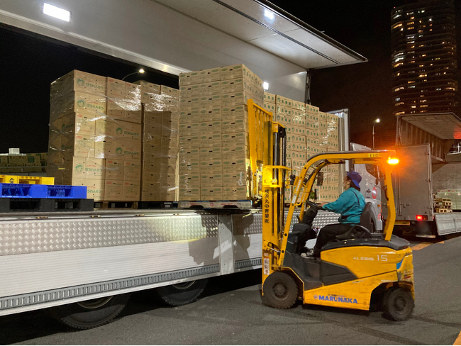 21:00~青果物の荷降し作業確認 ※2,000ケース級のバラ積み車両も同時刻に到着予定