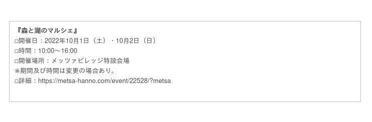 株式会社メッツァ(本社:埼玉県飯能市、代表取締役社長:村田昭悟)は、国内最大級の北欧ライフスタイル体験施設「メッツァビレッジ」にて、10月1日(土)・10月2日(日)の2日間、第14回「森と湖のマルシェ」を開催いたします。