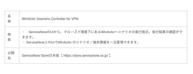 これは、2021年3月に提供を開始した「WinActor Spoke for ServiceNow」*1に続きNTT-ATが 「ServiceNow Store」より提供する2本目の連携アプリケーションであり、クローズド環境下にあるWinActorへのシナリオ実行指示や管理が可能になります。