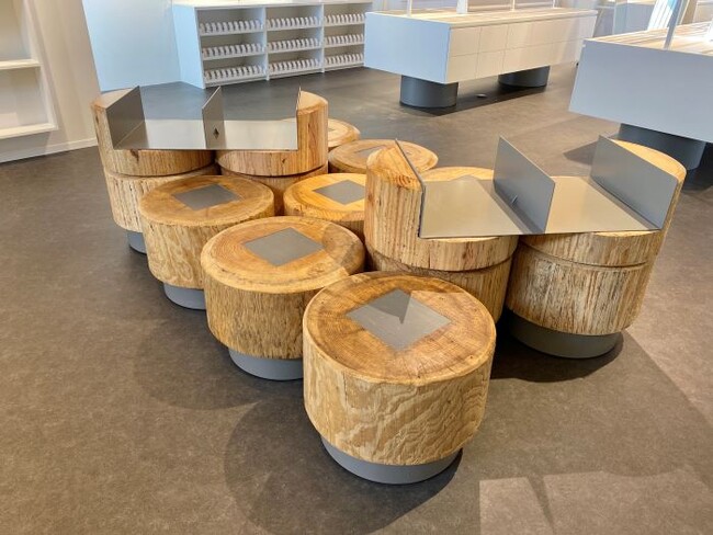 店舗設計は建築家の平居直氏が担当しました。店内の待合スペースのスツールや本棚には、岸和田だんじり祭で実際に使用した、だんじりの車輪を再利用。車輪の形状はそのままに、集積して形成したスツールや本棚は、趣を残しつつも店内でひときわ存在感を放ちます。街の歴史をつくってきた一部が、新たに店舗の一部として空間を彩ります。また、店内には岸和田だんじり祭に関する書籍など約350冊を陳列し、街の歴史に触れることができる場所を目指しました。