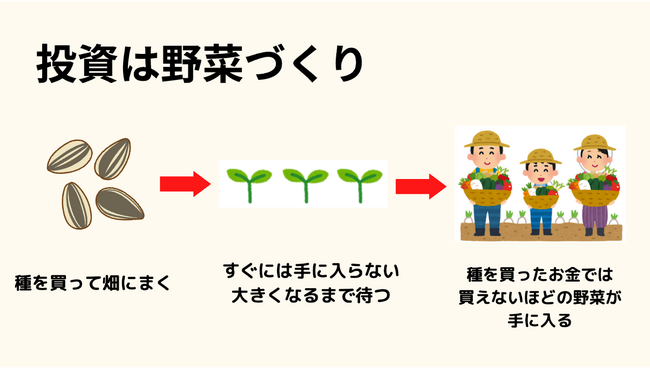 投資を野菜作りに、リスクを台風や猪などに例えながら、投資への向き合い方やリスクを伝えました。