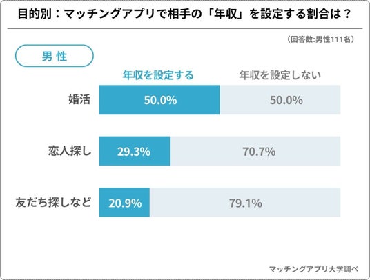 男性は婚活目的でマッチングアプリを利用している人は半数が、「相手の年収を設定する」と回答しました。恋人探しの場合は設定する割合は約3割になり、友だち探しなどの目的でマッチングアプリを利用する人は約2割程度が「年収」を設定しています。