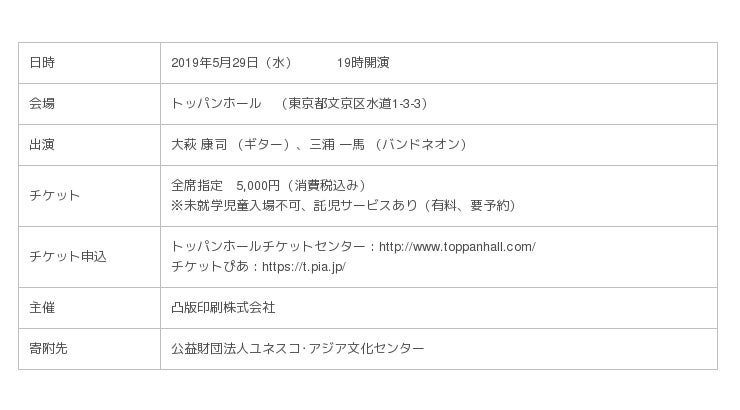 第12回となる今回は、5月29日公演にクラシックギターの大萩康司とバンドネオン奏者の三浦一馬を迎えた魅惑のデュオを、6月6日公演ではソプラノ歌手の森麻季による可憐な歌声をお届けします。
