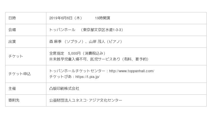 凸版印刷株式会社(本社:東京都千代田区、代表取締役社長:金子眞吾、以下 凸版印刷)は、2019年5月29日(水)と6月6日(木)の2日間、「第12回 トッパン チャリティーコンサート」を開催します。「トッパン チャリティーコンサート」は、凸版印刷が国際社会の課題である「識字能力の向上」を支援する社会貢献活動として2008年から毎年開催しています。