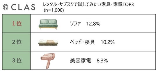 なお、2023年1月に実施したWebアンケート調査では、レンタル・サブスクで試してみたい家具・家電の第1位はソファ(12.8%)、第2位はベッド・寝具(10.2%)、第3位は美容家電(8.3%)という結果になりました。