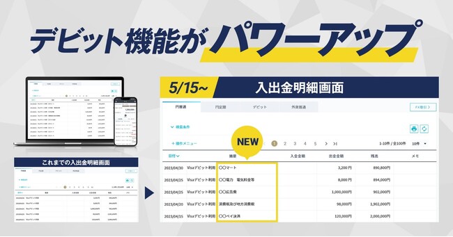 GMOあおぞらネット銀行株式会社(以下、当社)は、Visa・Mastercard(R)デビットカード(*1)の利用先(*2)が、インターネットバンキングの入出金明細上でも表示される機能改修を行い、2023年5月15日よりお客さまにご利用いただけるようになります。