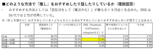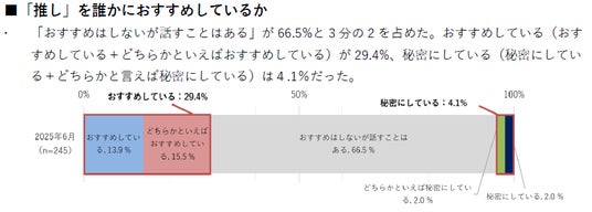 注目すべきは、推しを語ることがごく自然になっていることです。「秘密にしている」人はわずか4.1%で、9割以上が推しについて誰かに話していました。SNSでの発信も、50代で2割を超えています。「母と話題の共通点が増え、会話が多くなった」「主人との会話が楽しくなった」など、推しを介して人間関係が豊かに潤っている様子も伺えました。
