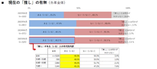 「推し」に関する意識・実態調査は、今年で4年目となります。50代以上女性で「推しがいる」と答えた人は46.3%と前年並みでしたが、年代による差は縮小。50代が48.5%、60代が46.2%、70代が45.1%とほぼ横並びになりました。推し活が一部の若い世代の流行ではなく、世代横断の日常のなかに定着しつつある、ということを示しています。