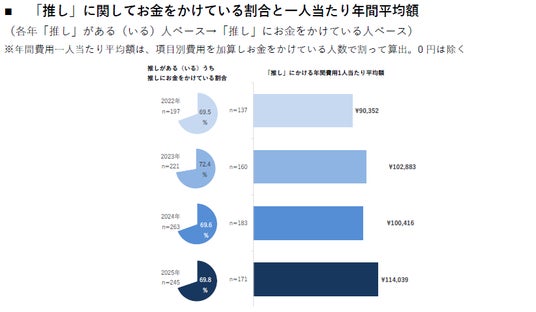 「推し」ありの人のうち「推し」にお金をかけている人の割合は69.8%で横ばい、かけている年間平均額は114,039円で昨年より増加。活動内容別に費用をみると「遠征費」「聖地巡礼費」は減、「チケット代」「映像・音楽の購入費」「応援グッズ」などが昨年より増加した。