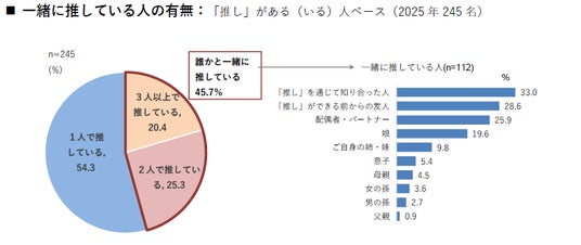 - 「推し」がある(いる)人に、「推し」を自分1人で推しているか、誰かと一緒に推しているかを聞いたところ、「自分1人」が54.3%を占めた。