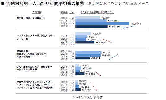 項目別では「チケット代」「映像・音楽の購入費」「応援グッズ」などが増加。「遠征費「聖地巡礼費」は減少した。