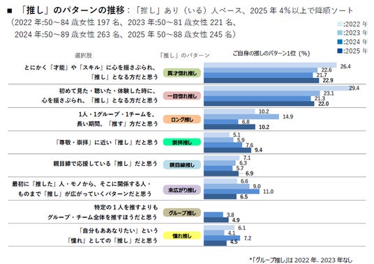 推しのパターンとしては「異才惚れ推し」「一目惚れ推し」がこの4年間上位をキープ。減少傾向だった「ロング推し」は、今年は増加して1割を超えた。
