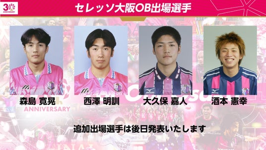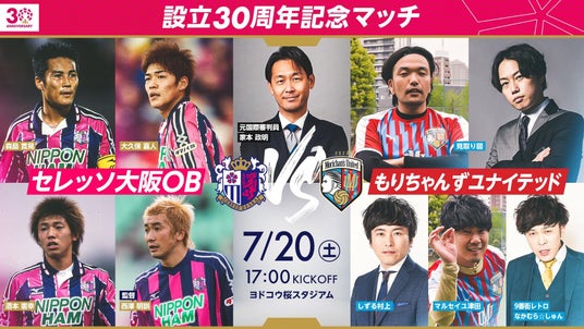 7/20(土)新潟戦をセレッソ大阪設立30周年マッチとして開催し、前座試合として「セレッソ大阪OB vs もりちゃんずユナイテッド」による30周年記念スペシャルマッチを実施します。セレッソ大阪の30年を彩った、西澤明訓さん、大久保嘉人さん、森島寛晃社長などがセレッソ大阪OBチームとして出場します。対戦相手として、セレッソ大阪のイベントにも出演いただいたこともある見取り図率いる「もりちゃんずユナイテッド」が来場します。また、主審には元国際審判員の家本政明さんが務めていただく事も決定いたしました。ここでしか見ることの出来ない、30周年記念スペシャルマッチをぜひご覧ください!実施日時
