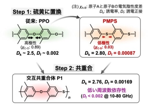 そこで、研究グループは、従来の低誘電材料であるPPOの酸素原子を硫黄に置換したジメチル置換PPS (PMPS) と、これらの交互共重合体※13 P1に新しく着目しました (図1)。