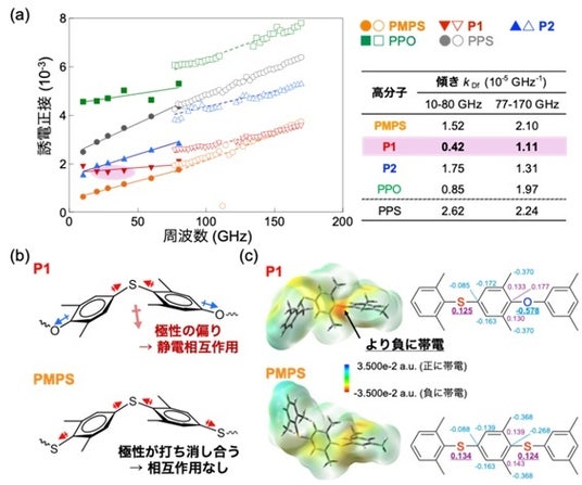 さらに、PPO骨格とPMPS骨格を交互に配置したP1は、他の高分子と異なり周波数が増加しても誘電正接がほぼ変化せず、80 GHzにおいても安定して0.002未満の低誘電正接を維持しました。また、この低い周波数依存性は170 GHzという更に高い周波数帯でも維持されました (図2a)。詳細な機構を調べると、PMPS骨格とPPO骨格が交互に並ぶP1でのみ極性が微小に偏り、高分子鎖間に静電相互作用※15が発現することで電気信号に伴う分子運動が抑制され、幅広い周波数帯においてエネルギー損失を抑えられることが分かりました (図2b, c)。