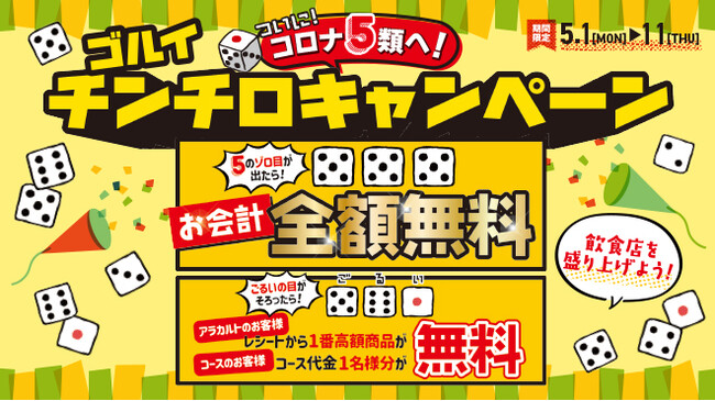 <アフターコロナへ本格始動!!> 「美味しいね!」のやり取りにお腹も心も満たさせる♪ 大切な友人や家族との楽しい飲み会を取り戻すべく『ゴルイ!チンチロキャンペーン』を開催致します! グループの代表者にサイコロ3個まとめて振っていただき、出た目に応じて割引サービス!! 「5」のゾロ目が出たら、なんとお会計が全額無料!5類(ごるい)にちなみ「5」「6」「1」の目が揃えば、『レシートから1番高額商品が代金無料(アラカルトのお客様)』または『コース代金1名分無料(コースのお客様)』でご利用いただけます! チンチロリン♪今夜も響く勝負の音! ハズレを引いても損はなし!引き運試しの1発勝負に是非チャレンジしてみてください♪